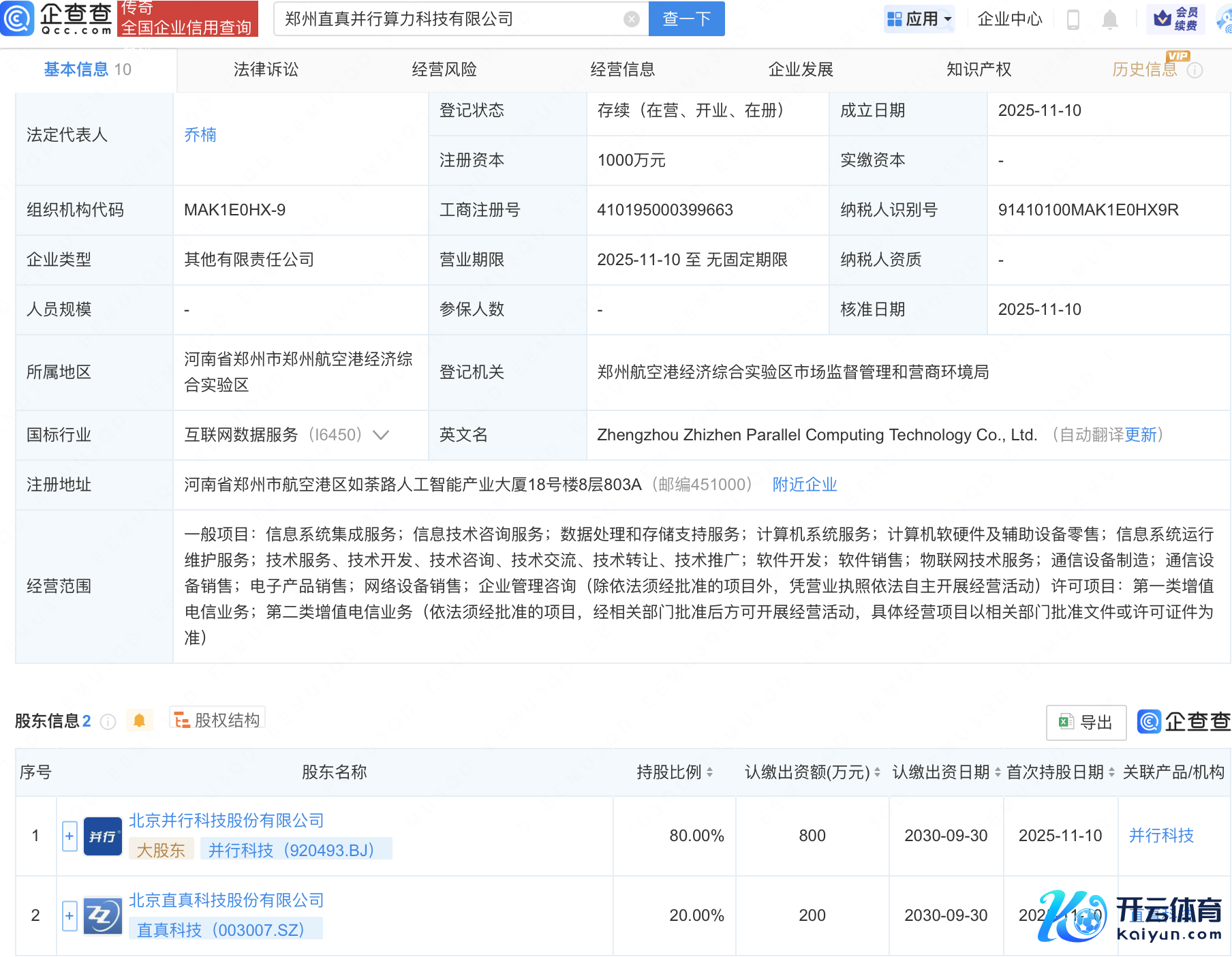 近日,郑州直真并行算力科技有限公司开导开云体育,注册成本1000万元,目标规模包含:数据惩办和存储维持办事;打算机系统办事;物联网本事办事;通讯开导制造等。企查查股权穿透走漏,该公司由并行科技(920493)、直真科技(003007)共同握股。