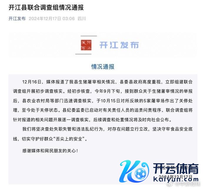 【#官方通报生猪宰杀黑窝点乱象#:已关停5家宰杀场,运转追责要领】据“开江发布”音问,四川达州开江县相连造访组12月17日通报体育游戏app平台,12月16日,媒体报说念了开江县生猪宰杀相关情况,县委县政府高度喜欢,立即组建相连造访组开展初步造访核实。经初步核查,本年9月下旬,接到天下对于生猪宰杀情况的举报后,县农业农村局等部门赶快造访核实,于10月15日对所反应的5家宰杀场作出了关停处理,于今处于关停景况。县纪委监委已运转对相关职守东说念主员的追降低责要领。相连造访组将针对报说念的相关问题开展一一造访核实,后续造访和处分情况将实时向社会公布。
