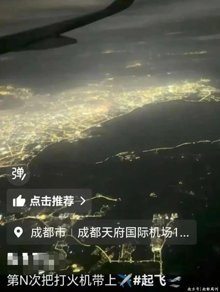上述网友在短视频平台发布视频,并配文称,“第N次把火机带上飞机。”视频闪现,该乘客坐在集合舷窗的座椅上,从挎包内掏出一枚打火机点火。透过舷窗,还能看识趣翼以及大地的夜景。