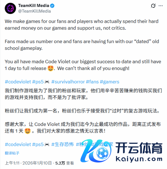 据外媒报说念,跟着PlayStation独占新作《Code Violet》 上线后执续遭受媒体差评,其确立商 TeamKill Media 也对月旦该作的媒体伸开了反击,并在外交媒体发文示意,他们并不是为月旦家制作游戏。