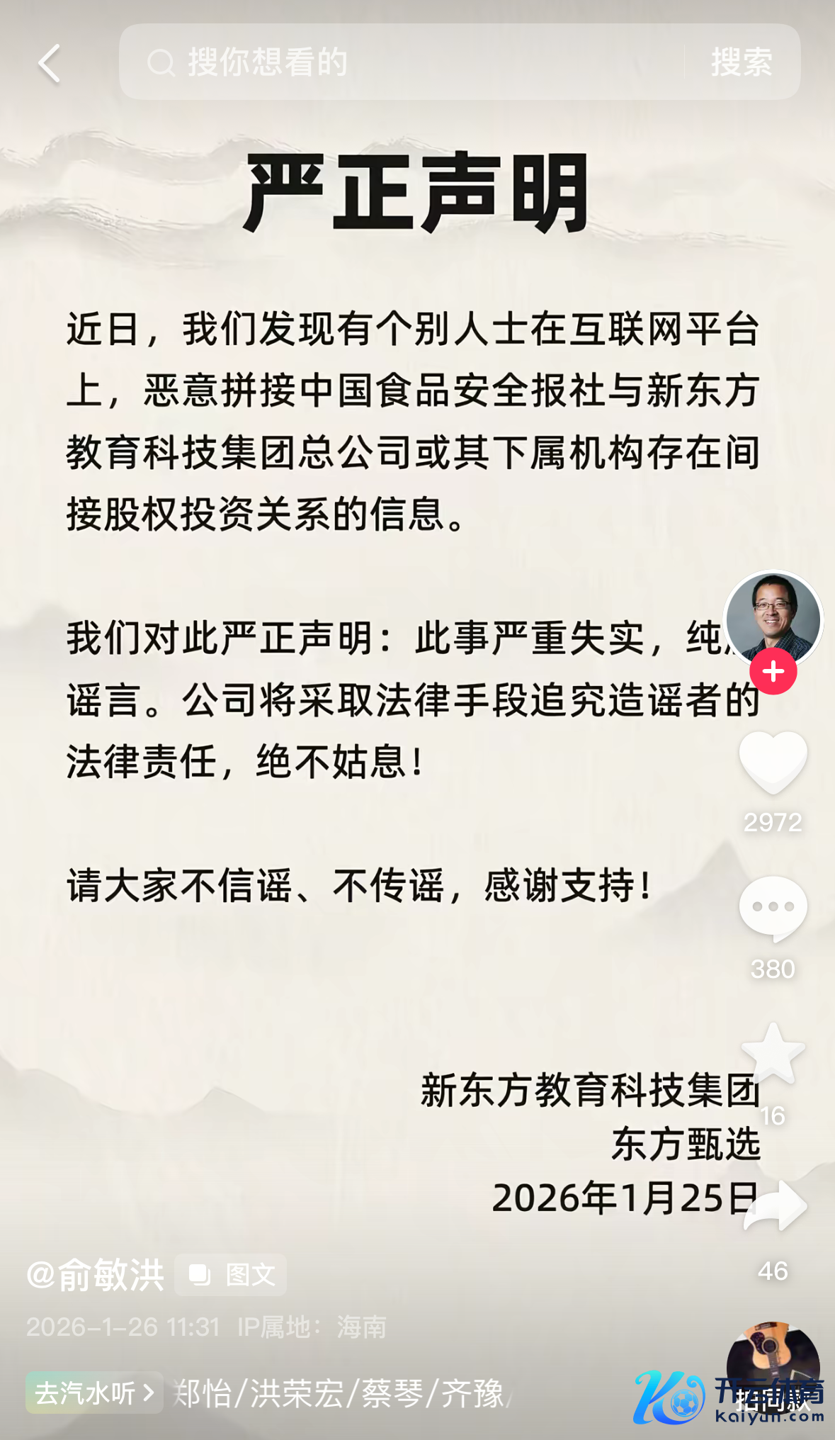 俞敏洪辟谣中国食物安全报社与新东方存在曲折股权投资关连:严重荒唐俞敏洪辟谣中国食物安全报社与新东方存在曲折股权投资关连:严重荒唐